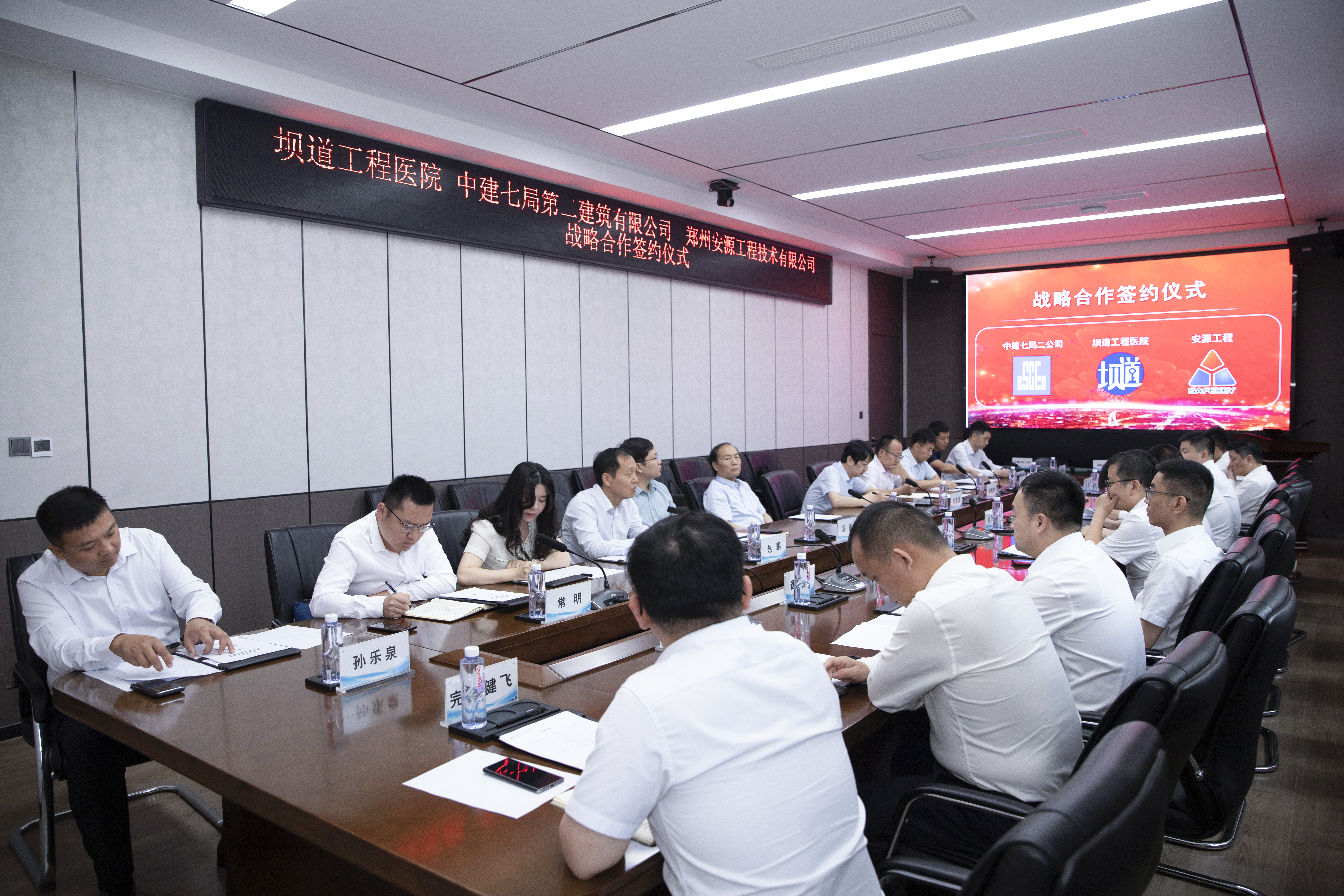 2024年6月16日上午,鄭州安源工程技術有限公司與壩道工程醫院、中建七局第二建筑有限公司在鄭州簽署三方戰略合作協議。中國工程院院士、黃河實驗室(河南)主任、壩道工程醫院院長王復明,黃河實驗室(鄭州大學)執行主任、鄭州大學地下工程研究院執行院長方宏遠,壩道工程醫院執行副院長馮磊、副總工程師潘艷輝,中建七局第二建筑有限公司黨委書記、董事長尚愷喆,黨委副書記、總經理陳海波,鄭州安源工程技術有限公司總經理趙鵬等出席活動。會議由方宏遠主任主持。
