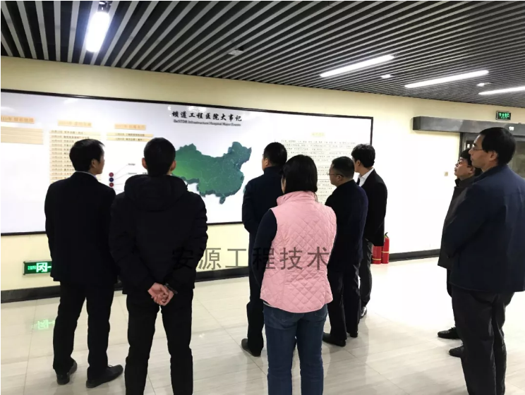 在我公司董事長助理關亞敏,副總工程師趙鵬,工程醫院運營負責人董杉,鄭州大學教授鐘燕輝、張蓓等相關人員陪同下,來訪者一行參觀了壩道工程醫院大事記、榮譽墻及公司的核心技術展覽室。
