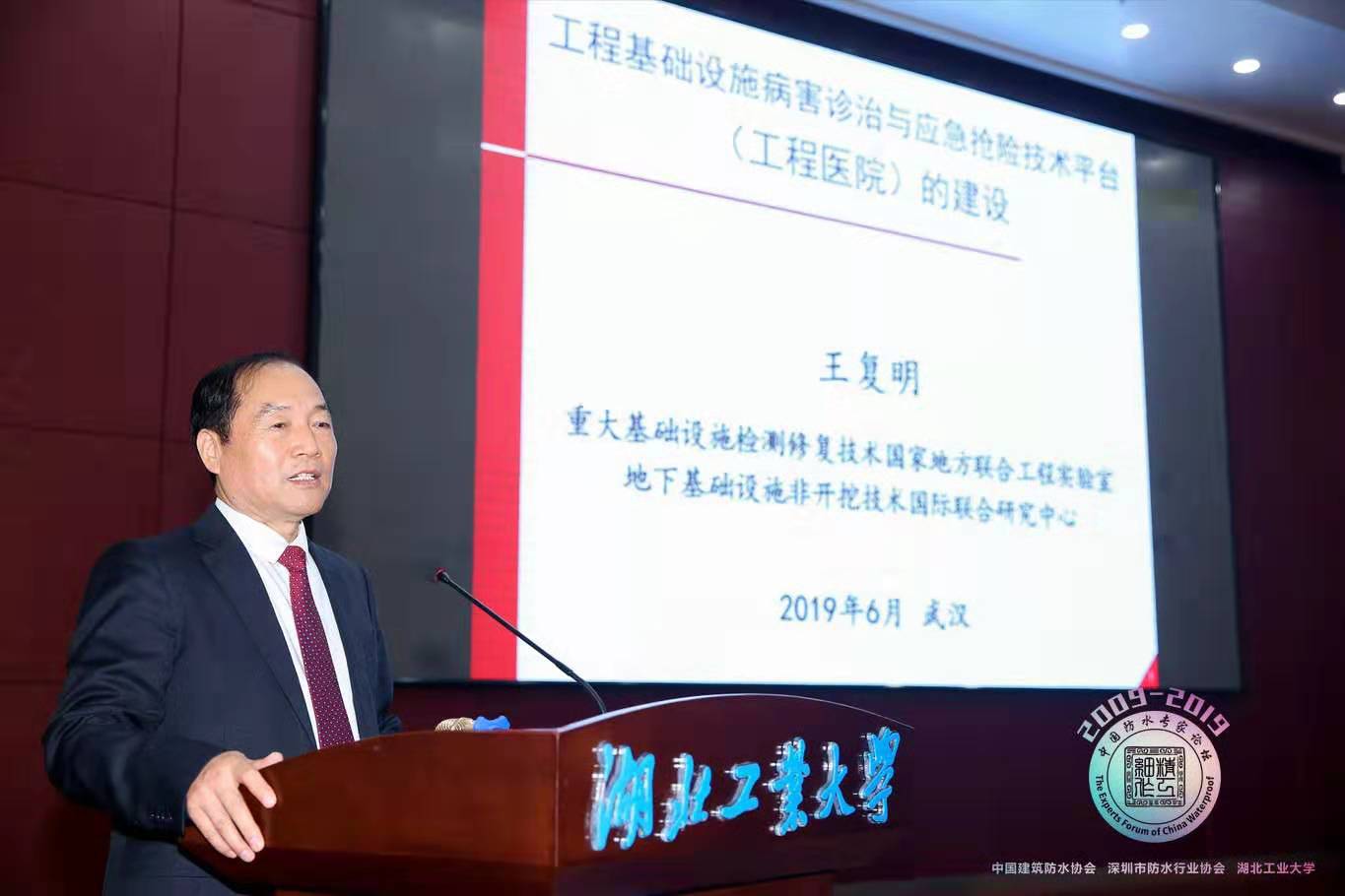 本屆盛會,兩位院士、七位中外知名專家?guī)砹巳龍鎏匮麍蟾婧土鶊鰧W術報告,為與會嘉賓帶來最新的防水研究成果和行業(yè)發(fā)展思路。王復明院士作了《工程基礎設施水災害防治技術的發(fā)展與“工程醫(yī)院”平臺建設》的特邀報告。“工程醫(yī)院”是為工程基礎設施(infrastructure)提供“健康檢測、病害診斷、修復加固、應急搶險”綜合服務的技術平臺,旨在打通水利、土木、交通等行業(yè)及學科界限,聚焦工程基礎設施 “疑難急險”病害災害防治,報告特別強調了對橋梁、隧道、堤壩、道路等基礎設施的水災害的防治。
