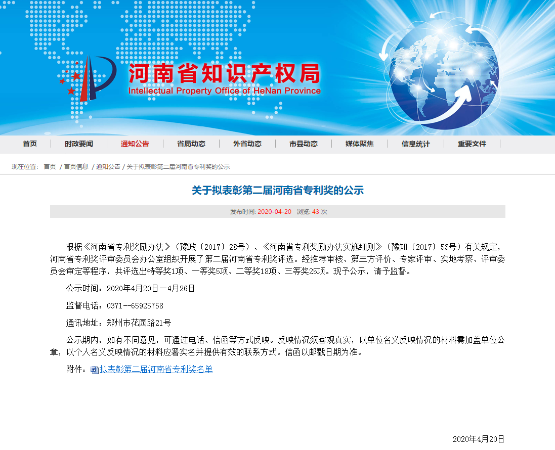 據了解,河南省專利獎由河南省知識產權局組織主辦,為深入實施創新驅動發展戰略、鼓勵發明創造、推動知識產權保護和運用、加快知識產權強省建設而設立。